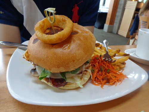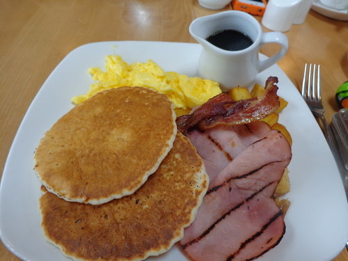 這裡全天都有早餐吃, 早, 午餐的價錢也不貴, 界於十到二十元之間.  早餐單價比 I Hop還便宜.  但是 I Hop 的早餐是美味豐富好多!  我想這裡終究是打 golg 的地方, 餐點的好吃於否, 就不是他們的賣點了.